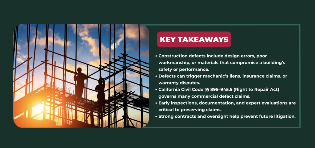 In California’s fast-moving commercial real estate market, deadlines and budgets often push construction teams to the limit. But when shortcuts lead to defective work, water intrusion, or structural issues, owners and developers can face serious financial risk.