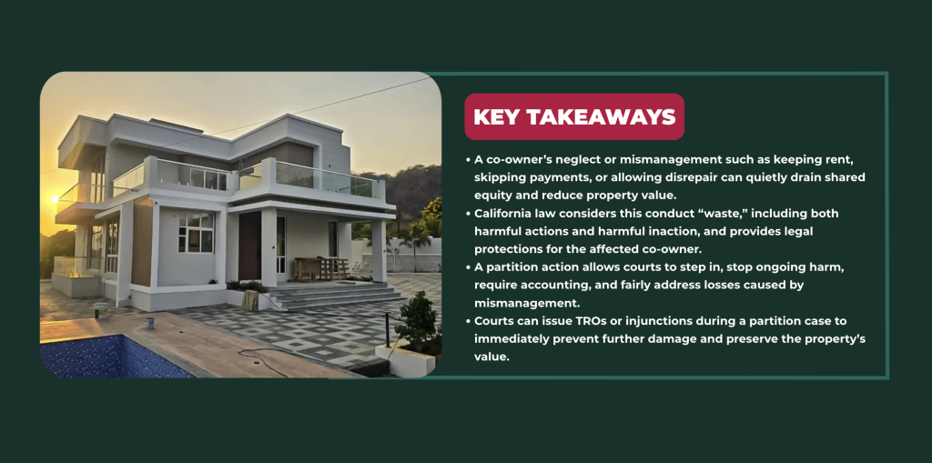 For example, a co-owner may collect rent but refuse to share the proceeds, stop paying the mortgage or property taxes, or allow the property to fall into disrepair while continuing to live there rent-free. Left unchecked, this kind of conduct can reduce market value, increase debt, and leave the responsible co-owner holding the financial consequences. California law recognizes this risk and provides legal tools that allow a co-owner to intervene early, before mismanagement or neglect causes permanent and irreparable damage to the shared investment.