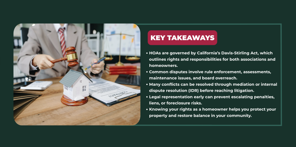 California law also allows prevailing parties in HOA litigation to seek attorney’s fees — making it essential to document every step of the dispute process.