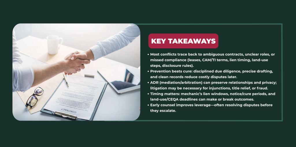 California commercial real estate deals move fast—and small contract gaps can become months of friction and unexpected cost. One missed clause, a misunderstood lease term, or a stalled permit can snowball into a dispute that risks timelines, revenue, and relationships.