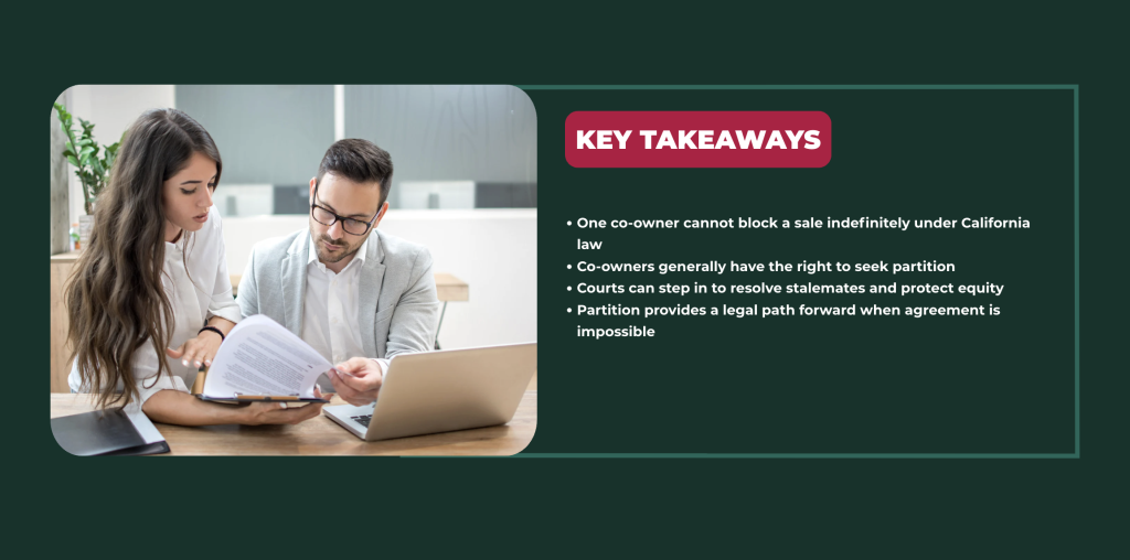 If you are stuck in a co-ownership dispute and cannot reach agreement, legal intervention can provide clarity, structure, and a path forward. California law is designed to prevent stalemates and protect your investment.